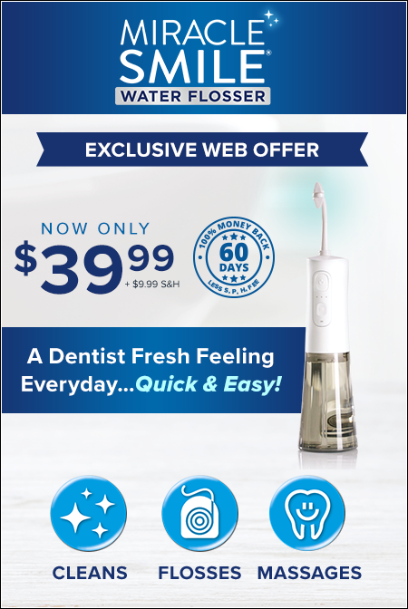 Introducing Miracle Smile, the revolutionary new water flosser that gently cleans and massages your entire mouth for a brighter, healthier smile and a dentist clean feeling right at home!